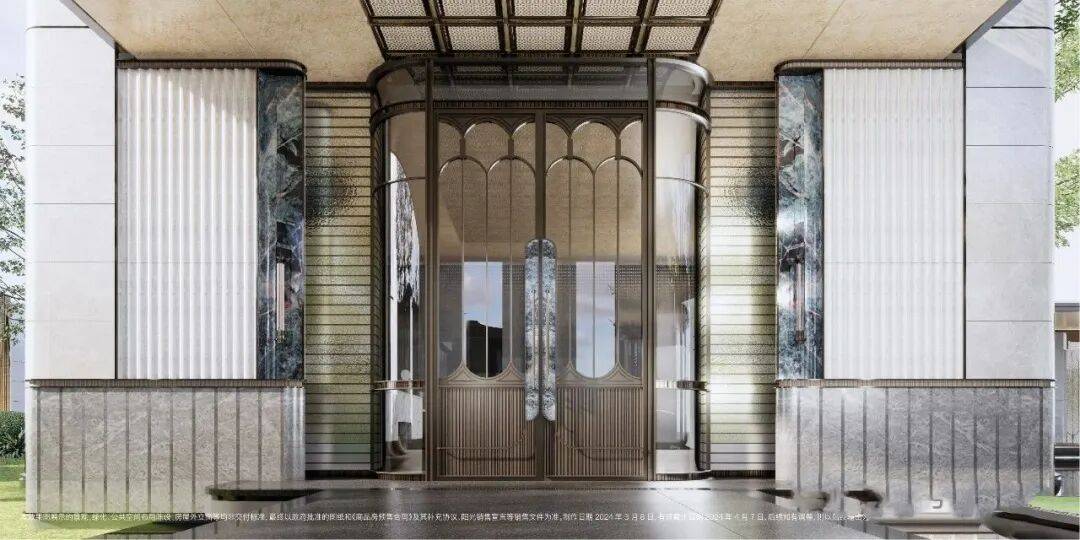 正在楼栋主入口同样利用石材+弧形铝板等元素,同时尚有格栅粉饰,质感晋升昭着: