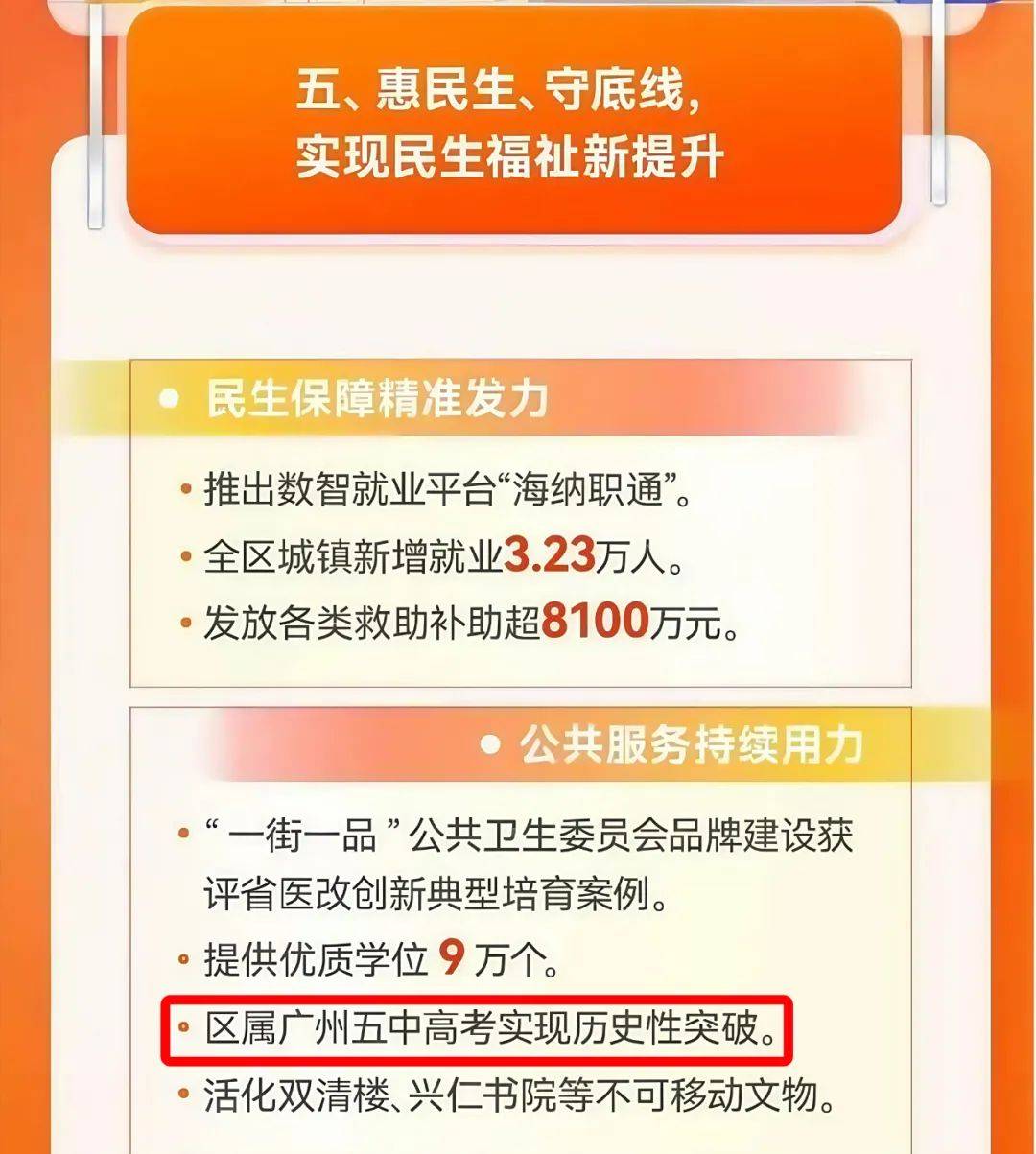 1个月前出炉的《2025海珠区政府办事呈文》,就分外外扬了“广州五中高考告竣汗青性冲破”!